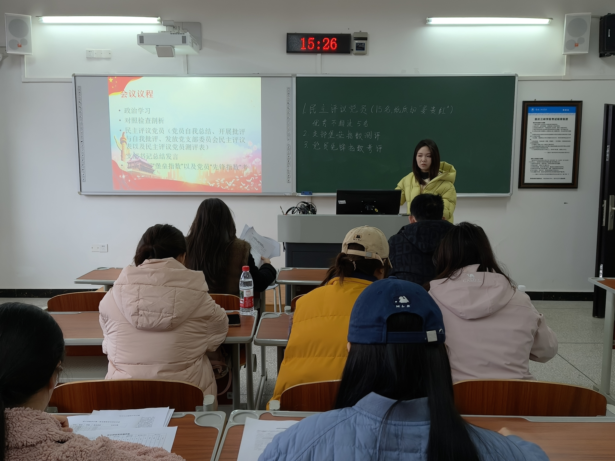 会上,全体支部成员首先集中学习了《中国共产党章程》中第九章、第十章内容;随后王莉、龙婷婷分别代表学生第一、第二党支部委员会作2025年度工作报告,全面总结了2025年度支部在思想建设、政治建设、组织建设、党员发展与教育管理、志愿服务、专业实践融合等方面的工作成效,深入查摆了支部工作中理论学习深度不足、组织生活形式创新不够、党员先锋模范作用发挥不充分等突出问题,深刻剖析根源,并明确整改措施与努力方向。