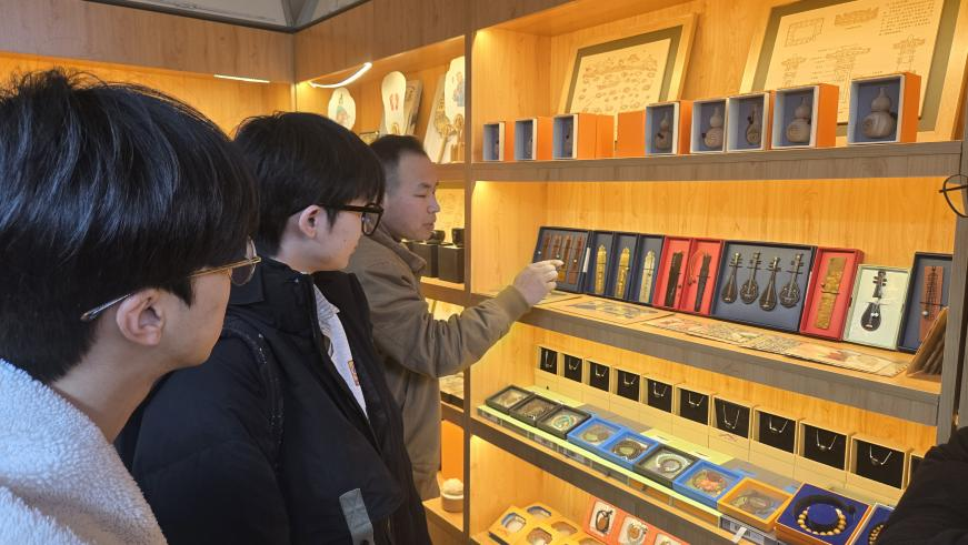 重庆新珺涵文化艺术有限公司负责人曹艳刚带领师生一行参观了文创产品展示区,公司设计的非遗主题饰品、城市文化IP周边、创意家居摆件等特色文创用品精彩呈现,激励学生深入挖掘文化内涵,在创作中积极融入生活洞察与创新思维。