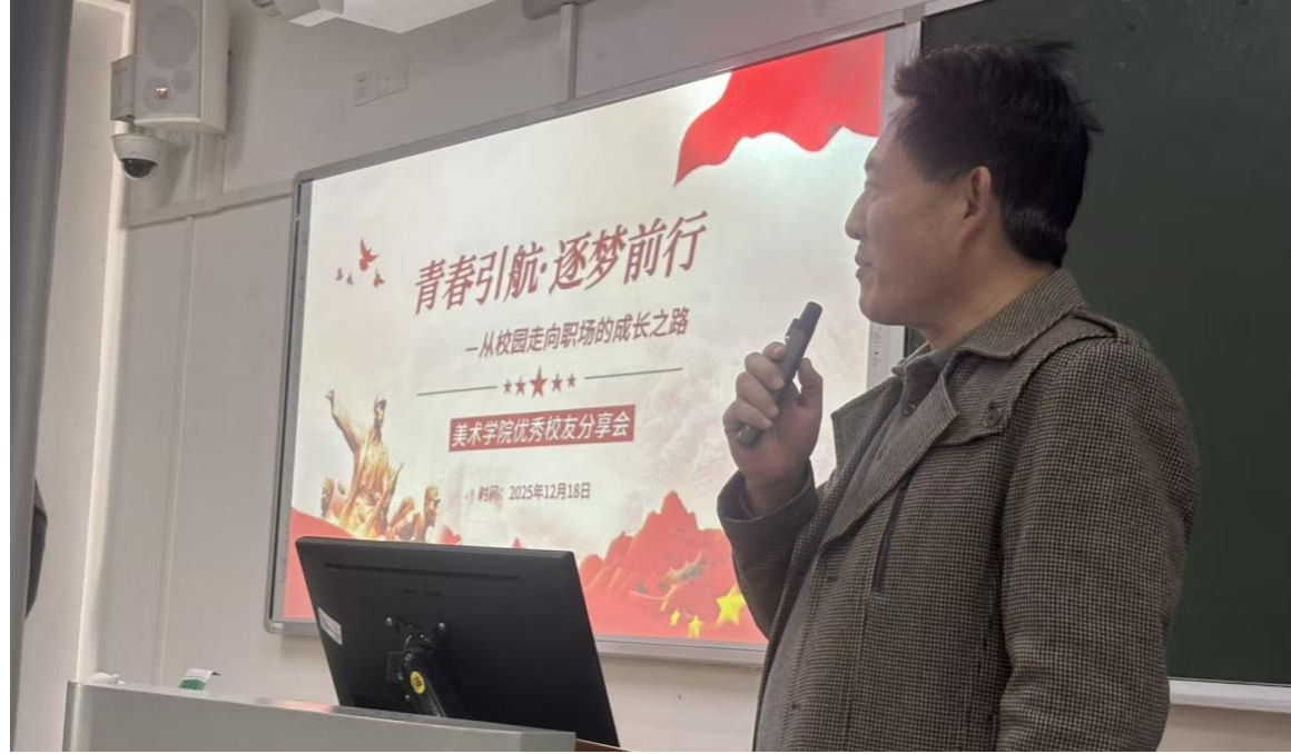 为进一步加强学院学风建设,提升学生职业规划能力,12月22日下午,美术学院在博学楼2栋108教室举办“青春引航,逐梦前行”优秀校友分享会。学院党总支书记田锋、重庆云鲁轩教育科技有限公司万州分公司校长赖发军、童彩艺术培训中心优秀校友骆飞亚老师、骆娟老师、大二辅导员王莉老师和大二、大三学生代表参加了本次活动。