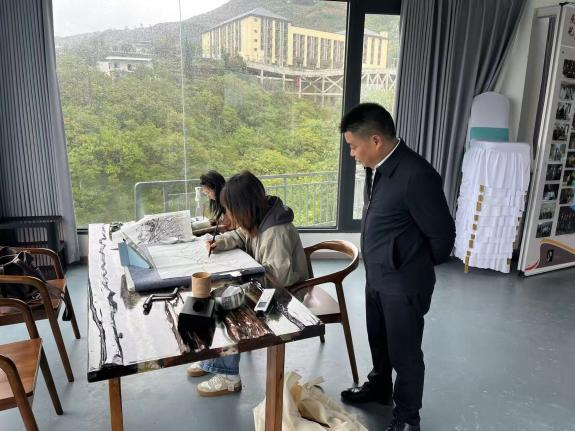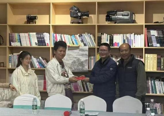 10月24日上午,在云玺台举行了“校地联动赋新能文旅融合促振兴——三峡学院美院学子赴建平乡云熙台民宿开展文化赋能活动”(图2),到场的嘉宾有:巫山县建平乡党委书记李养兵、柳坪村驻村第一书记何善斌、陈伟(县委组织部派驻)、党的建设办公室干部姚权。会上,李养兵书记对学生作品被收藏给予了高度认可,对艺术赋能乡村农文旅发展提出了展望,云玺台老板黄清为学生颁发收藏证书(图3),何善斌书记为学生分发收藏金(图4),教师王剑英和学生代表王骏发言(图5),借此次会议,云玺台为同学们的部分写生作品作了一个微画展。此次活动,是山水画教学助力乡村振兴的实践,是社会对我院学生专业能力的认可,体现了我院学生服务乡村振兴的能力不断提升,彰显了我院产教融合培养成效和服务库区发展能效。